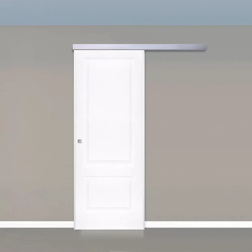 Porta scorrevole esterno muro C LASSIC BIANCO ,  non obbliga all'esecuzione di opere edili per incassare il telaio, ma mostra un binario superiore che permette al pannello di traslare parallelamente al muro, occupando uno spazio pari alla larghezza dell 'anta che non può essere arredato. K it scorrevole esterno muro Argento, unghiata tonda cromo satinato.