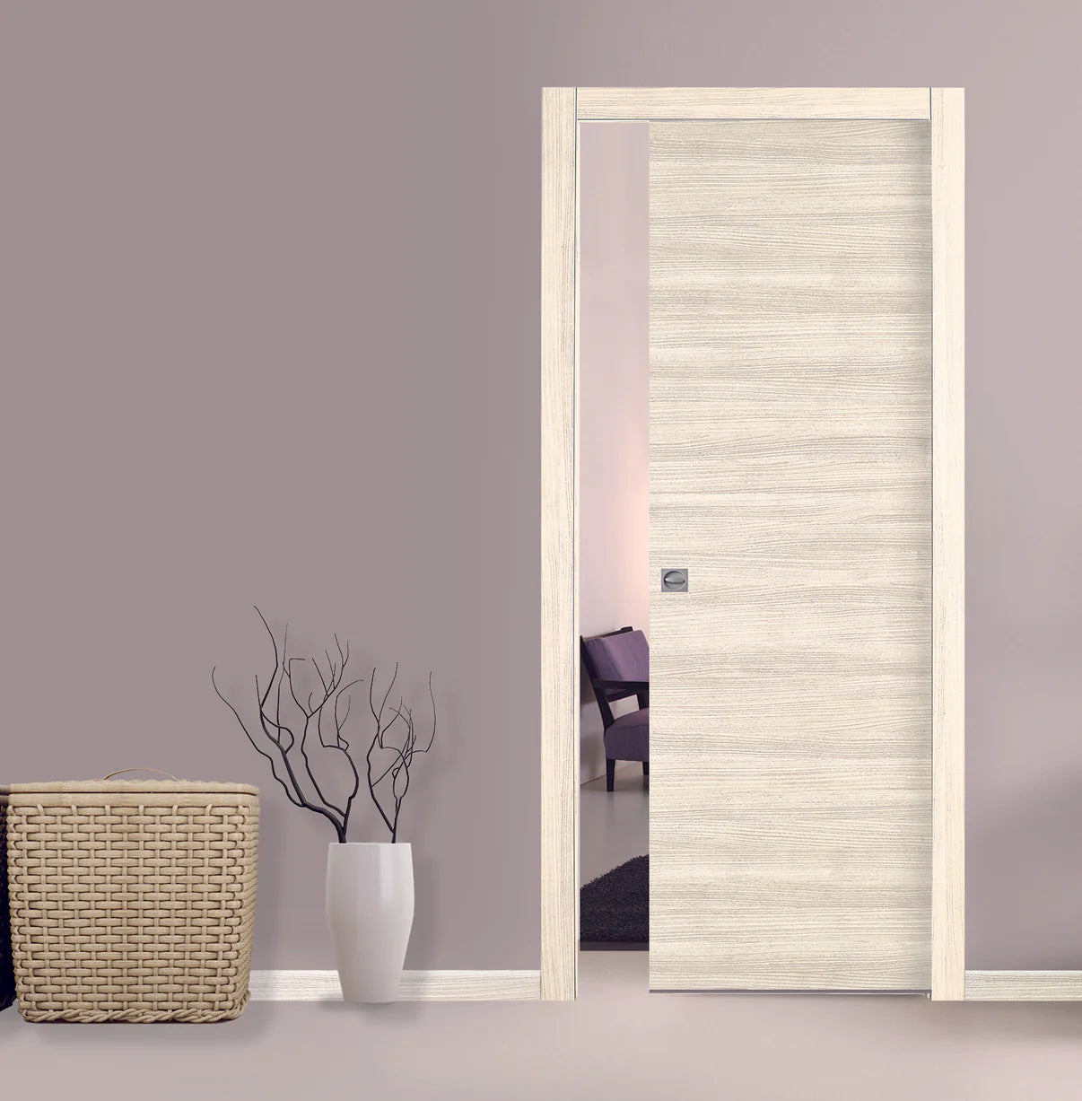Porta scorrevole interno muro AVENA, dotata di controtelaio incassato all’interno della parete (in muratura o in cartongesso) non occupa spazio all’interno della stanza, poiché l’anta trasla e scompare all’interno dal muro.