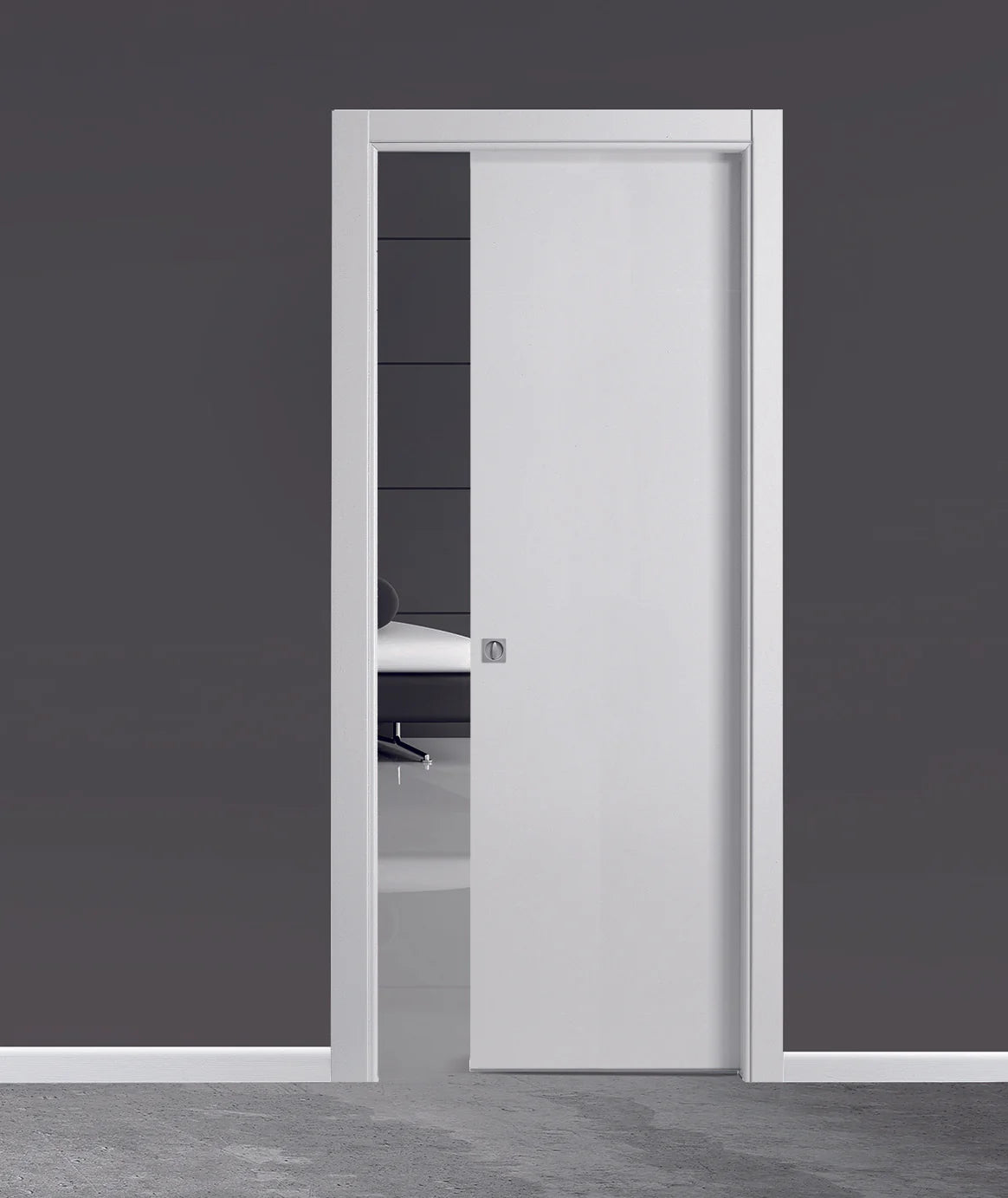 Porta scorrevole interno muro BIANCO HD, dotata di controtelaio incassato all’interno della parete (in muratura o in cartongesso) non occupa spazio all’interno della stanza, poiché l’anta trasla e scompare all’interno dal muro.