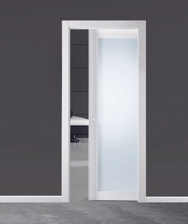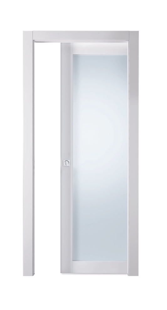 Porta scorrevole interno muro BIANCO HD VETRO, dotata di controtelaio incassato all’interno della parete (in muratura o in cartongesso) non occupa spazio all’interno della stanza, poiché l’anta trasla e scompare all’interno dal muro.