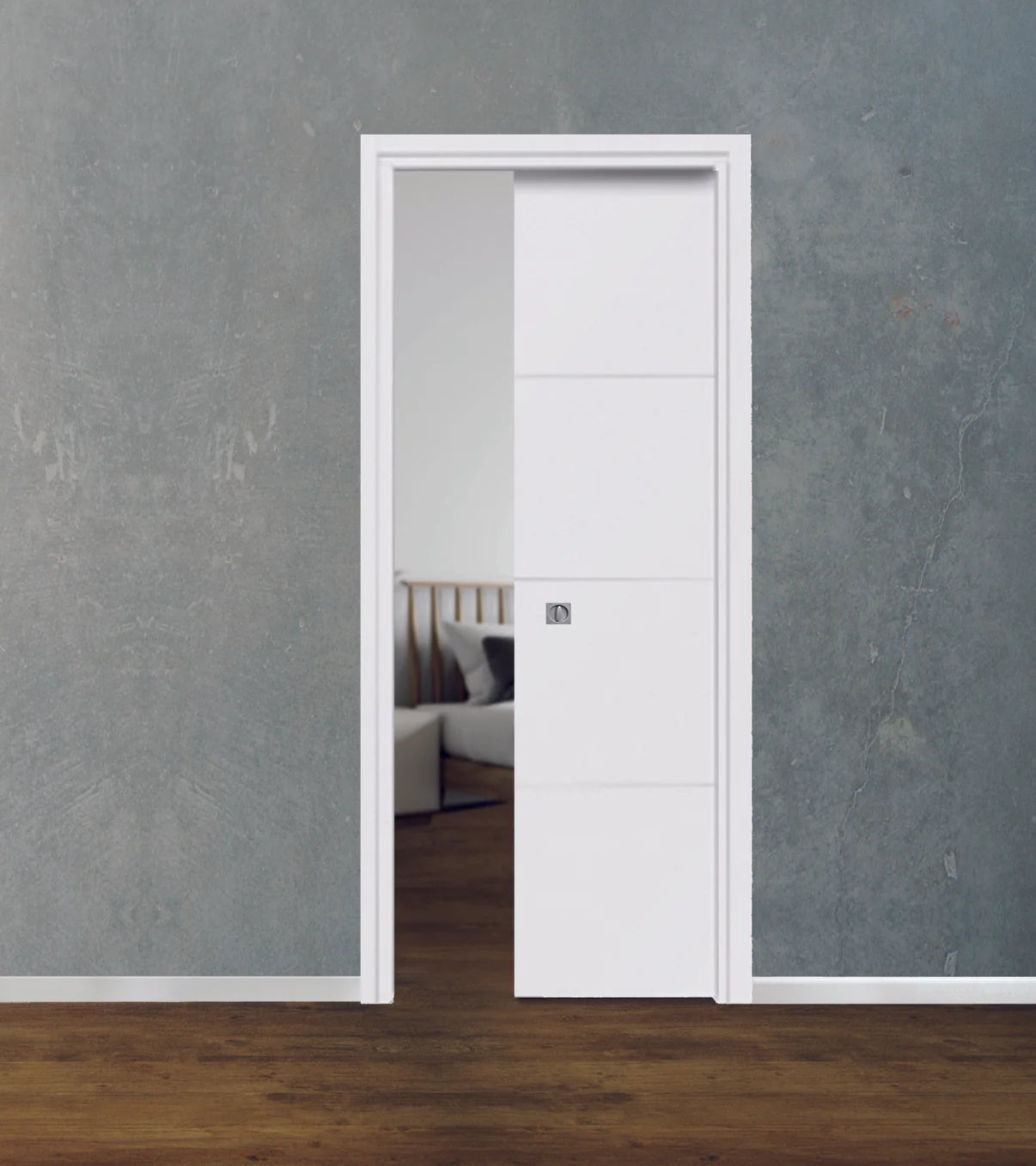 Porta scorrevole interno muro INCEASY 3, dotata di controtelaio incassato all’interno della parete (in muratura o in cartongesso) non occupa spazio all’interno della stanza, poiché l’anta trasla e scompare all’interno dal muro.