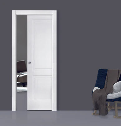 Porta scorrevole interno muro STYLE BIANCO LACCATO, dotata di controtelaio incassato all’interno della parete (in muratura o in cartongesso) non occupa spazio all’interno della stanza, poiché l’anta trasla e scompare all’interno dal muro.