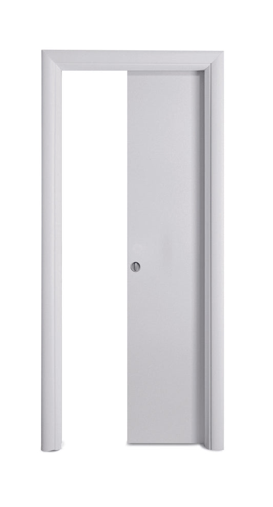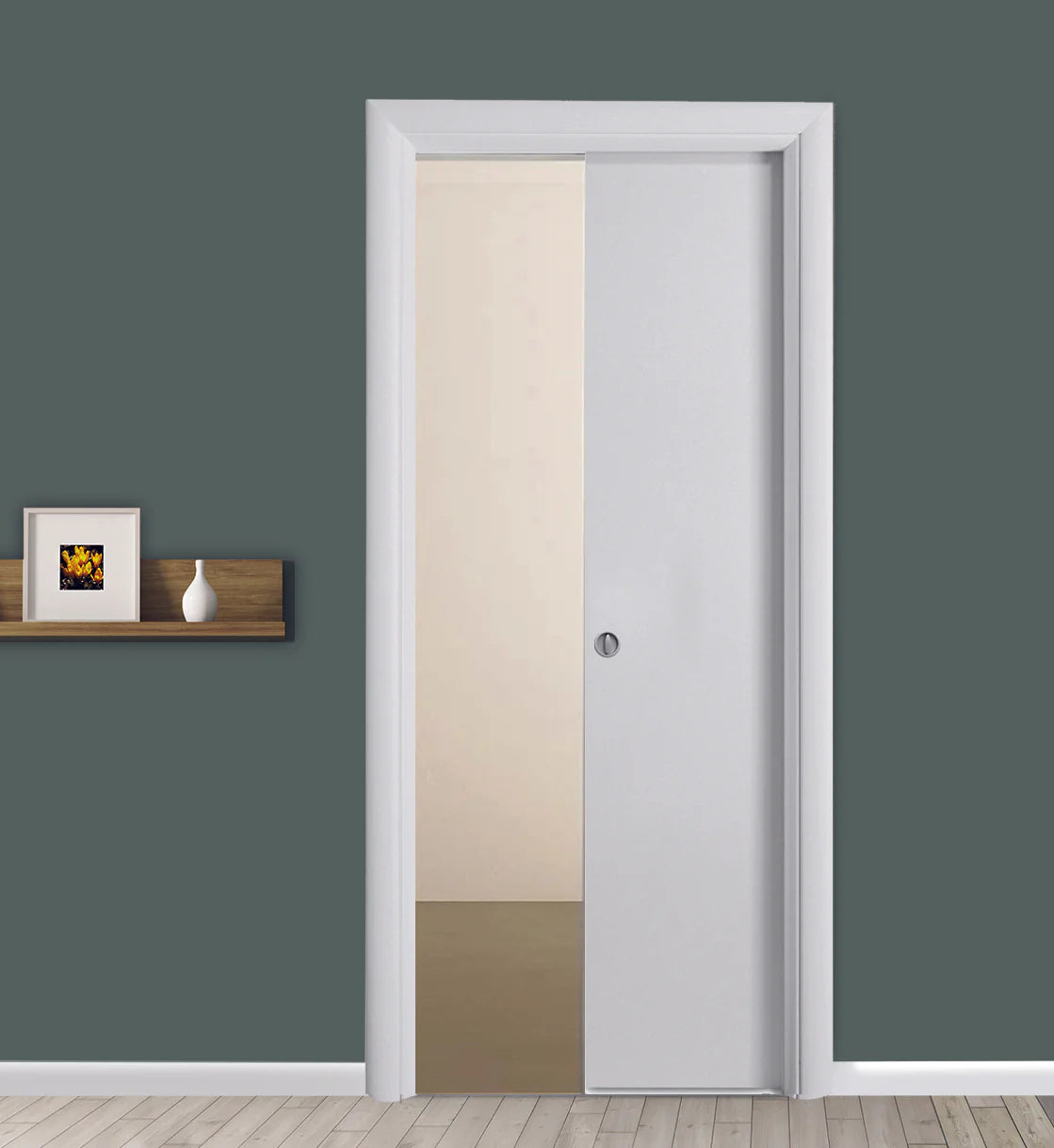 Porta scorrevole interno muro TONDA BIANCO, dotata di controtelaio incassato all’interno della parete (in muratura o in cartongesso) non occupa spazio all’interno della stanza, poiché l’anta trasla e scompare all’interno dal muro.