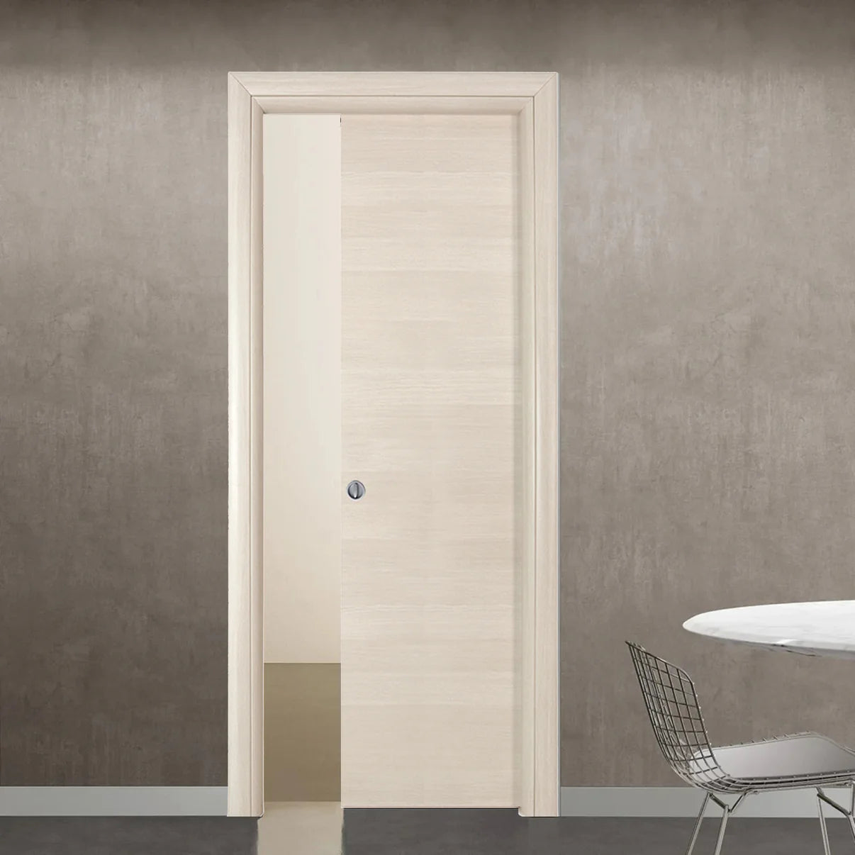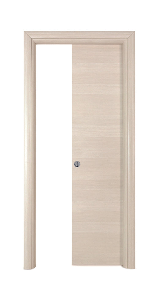 Porta scorrevole interno muro TONDA ECRU', dotata di controtelaio incassato all’interno della parete (in muratura o in cartongesso) non occupa spazio all’interno della stanza, poiché l’anta trasla e scompare all’interno dal muro.